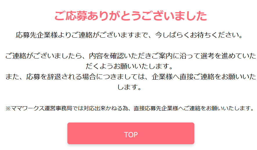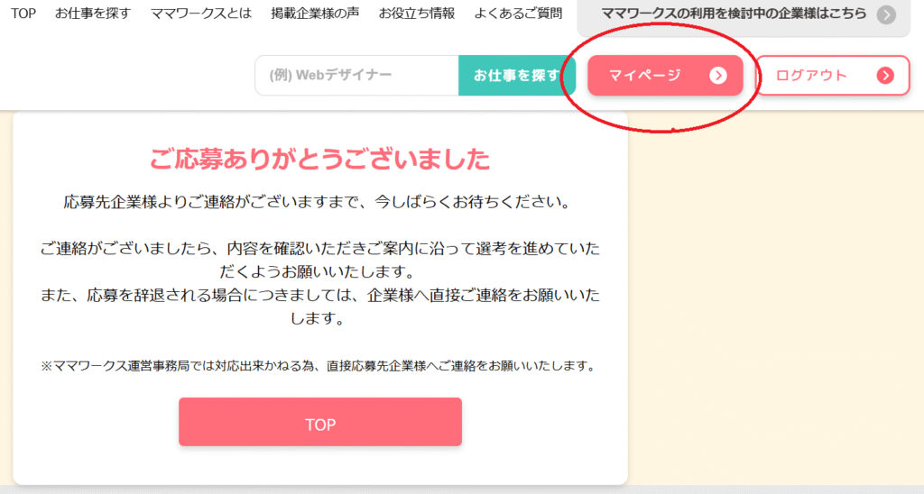 応募をした企業からの連絡は、ママワークスのマイページから連絡が来ます。TOP画面右上にマイページがあるのでこちらを開きます。